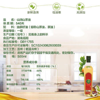 平江县山润(透明玻璃瓶)秘制原味山茶油500ML*1