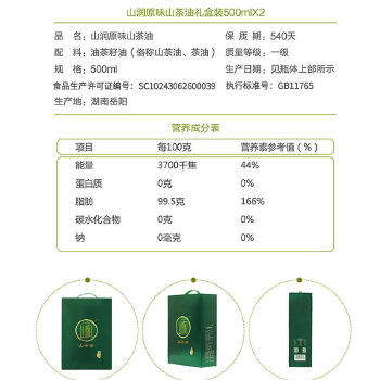 平江县山润(玻璃S瓶印花)原味山茶油(500ML*2佳品礼盒)