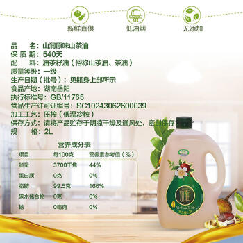 平江县山润低温冷榨原味山茶油2L(PE瓶)