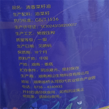 湖南娄底 湘山清香菜籽油 5L/瓶