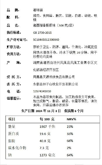 湘西特产跑山猪原味腊香肠500g