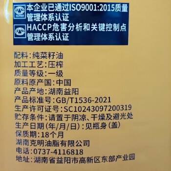 益阳高新区陈克明物理压榨菜籽油 5L