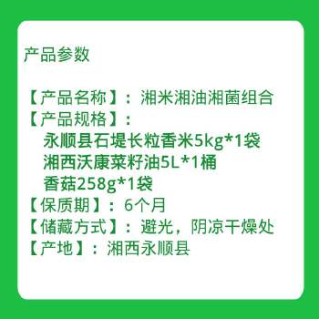 衡阳市仓自营 湘米湘油湘菌组合装200元(永顺县石堤长粒香米5kg*1袋、湘西沃康菜籽油5L*1桶、香菇258g*1包) 200元