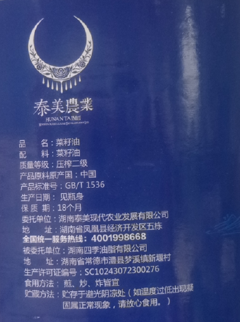 凤凰县 泰美农业 天星山 菜籽油 5L