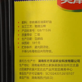 美津园土家小榨浓香菜籽油5L