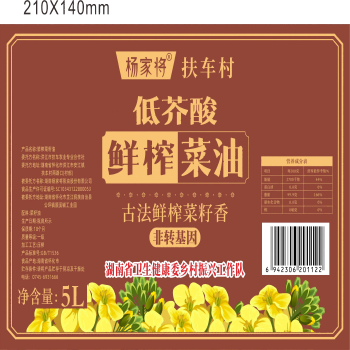 怀化市(湖南省卫生健康委)杨家将鲜榨菜油5L(瓶装)