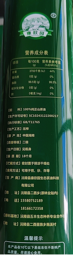 沅陵县康歆园物理压榨纯正山茶油1.5L*2礼盒装