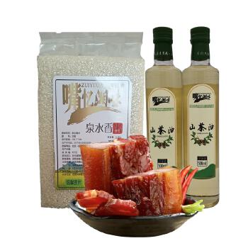 山茶油500ml*2瓶/盒 198元、泉水香米5KG/袋 89元、湘西柴火腊肉1.5KG/165元、产品售价452元,产品组合价400元。