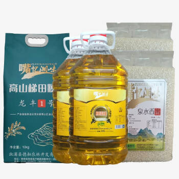 原香二级菜籽油10L/桶*2=358+泉水香米5KG/袋*2= 178元、 高山粳米10KG/袋*1= 138元、 产品售价674元, 产品组合价600元。