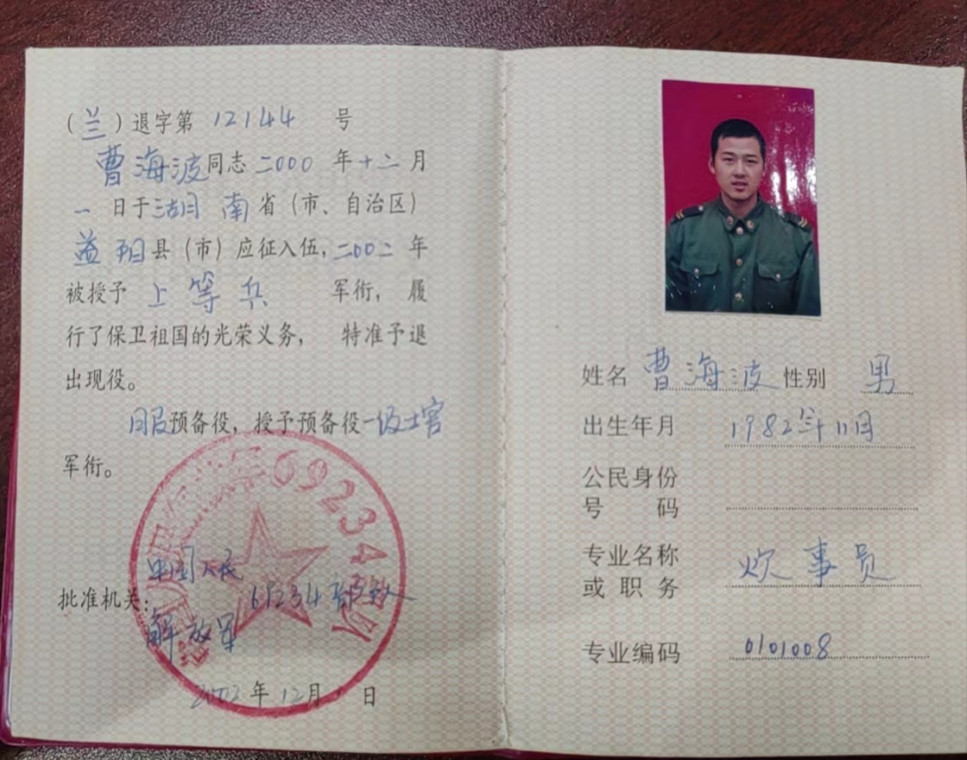 曹海波,于2000年12月1日于湖南省益阳市应征入伍,2002年被授予上等兵军衔,服预备役,授予预备役一级士官军衔。