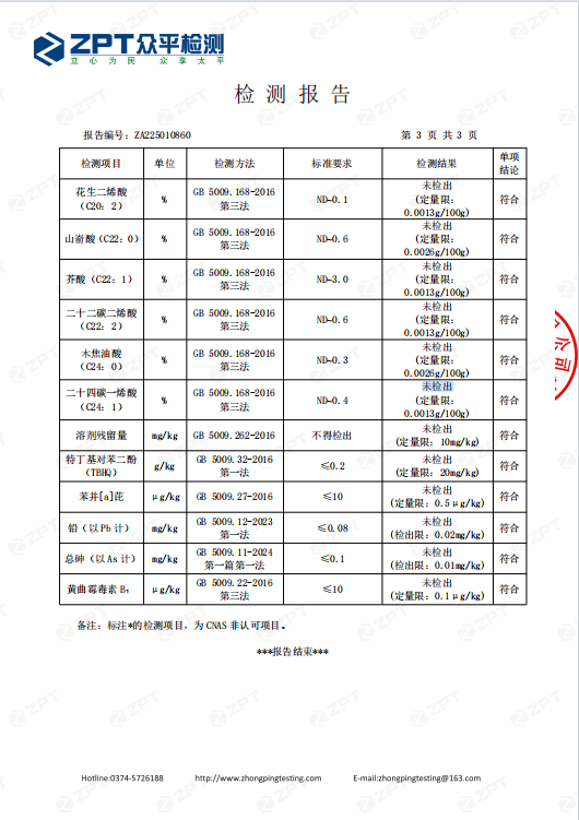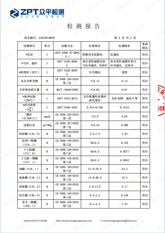压榨低芥酸菜籽油脂肪酸指标