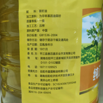 平江县惠百嘉纯正菜籽油5L/瓶