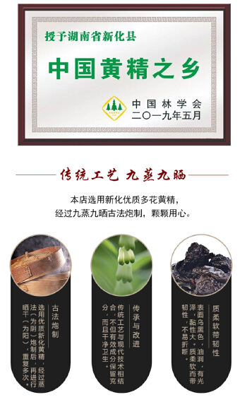 【正龙名居】黄精,选用‘中国黄精之乡-湖南新化’的道地野生多花黄精,辅以先进、安全、卫生、无添加的加工工艺,将传统与现代相结合,在保证充分蒸晒的基础上,最大可能的保留黄精多糖等有效成分与药性转化。【正龙名居】黄精口感:软、糯、香、甜,并且有效成分含量也领先于其他黄精产品。【正龙名居】黄精根据不同需求,开发出各种规格和包装的黄精产品,其中有:黄精片袋装、黄精片瓶装、黄精片礼盒包装、即食黄精片礼盒装、即食黄精片袋装、黄精丝瓶装、黄精丝礼盒装等,是您自用与送礼的优选。